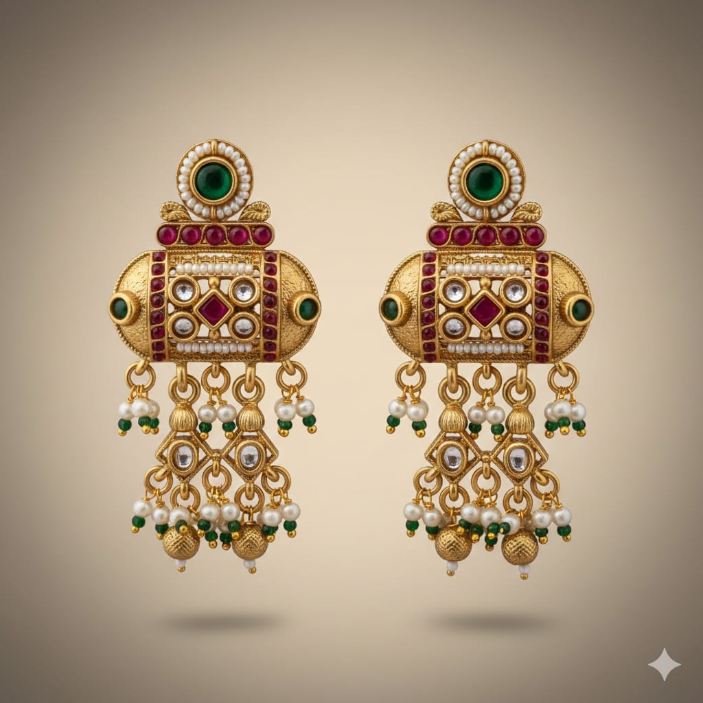 Geometric Gold Plated Earrings with Red and Green Stones