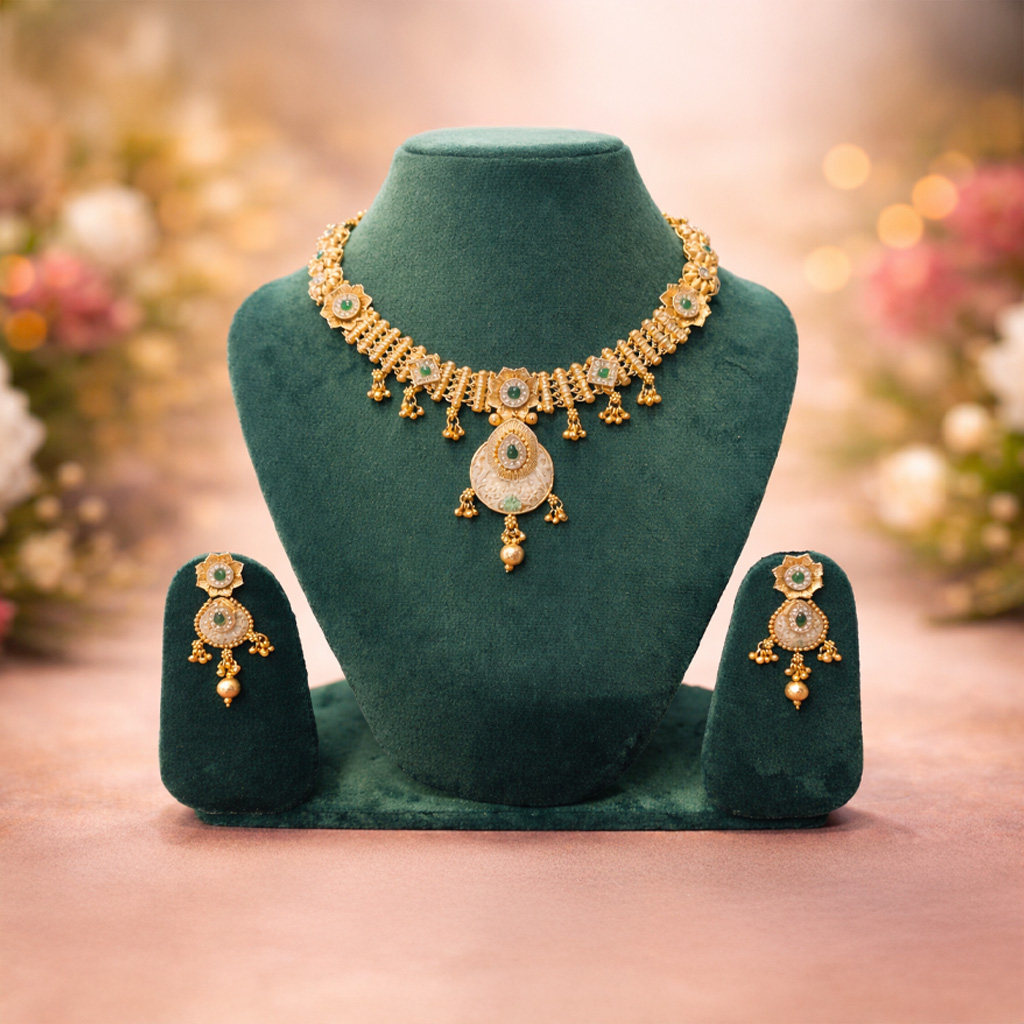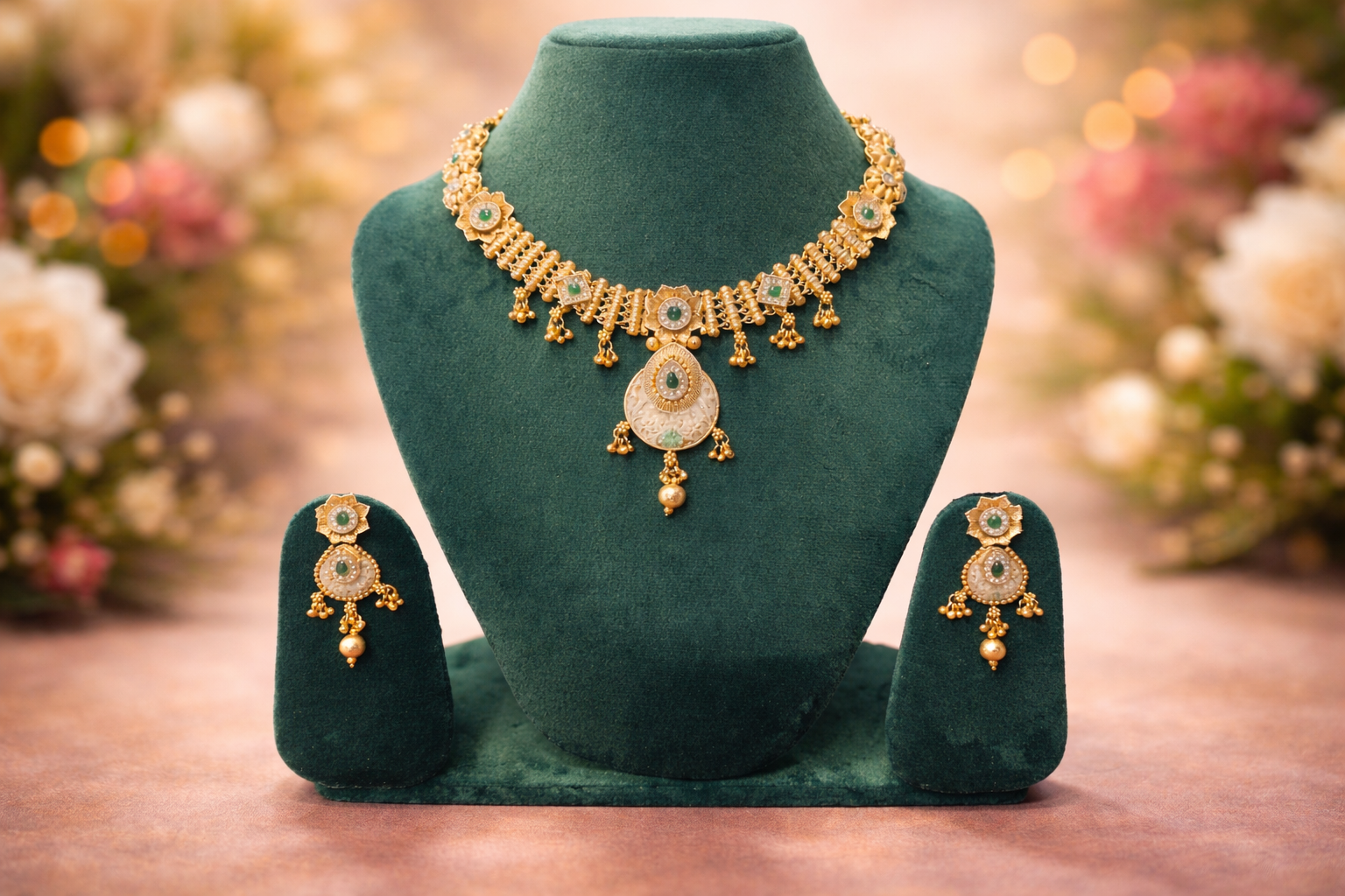 Inspired by royal heritage aesthetics, the piece blends classic design with wearable elegance. The rich gold finish paired with subtle green stone accents makes it perfect for weddings, festive occasions, and heirloom-style styling.
